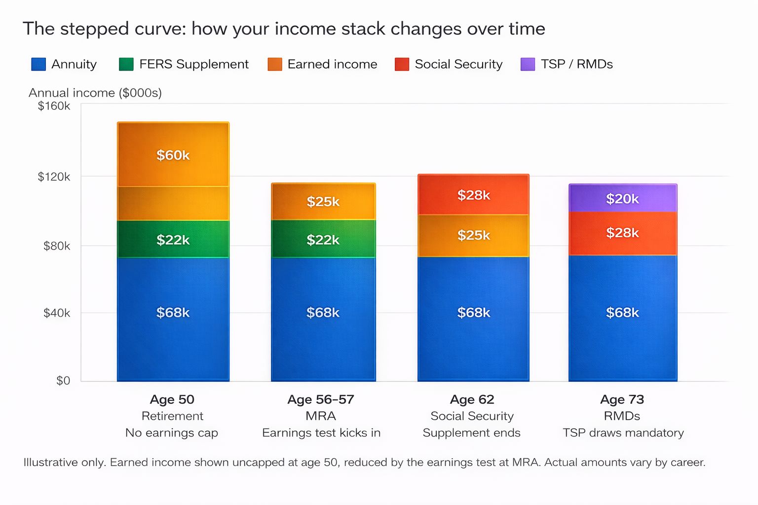 Retirement income isn't one number. It's a stepped curve, and every step has a decision attached to it.